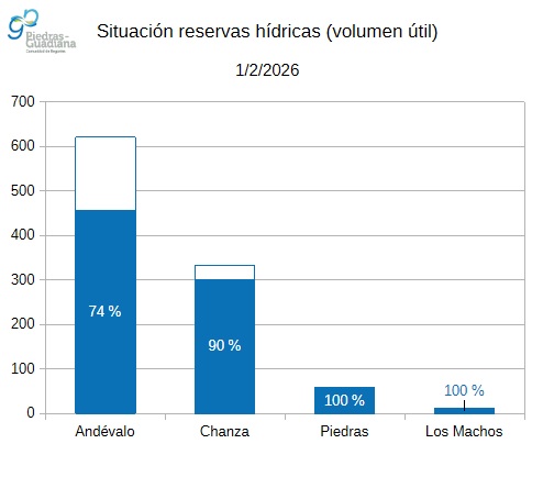 El volumen útil embalsado en el sistema Andévalo – Chanza – Piedras – Los Machos actualmente es de 826 hm³ (81 %). En la misma fecha del año anterior se situaba en 477 hm³ (47 %).